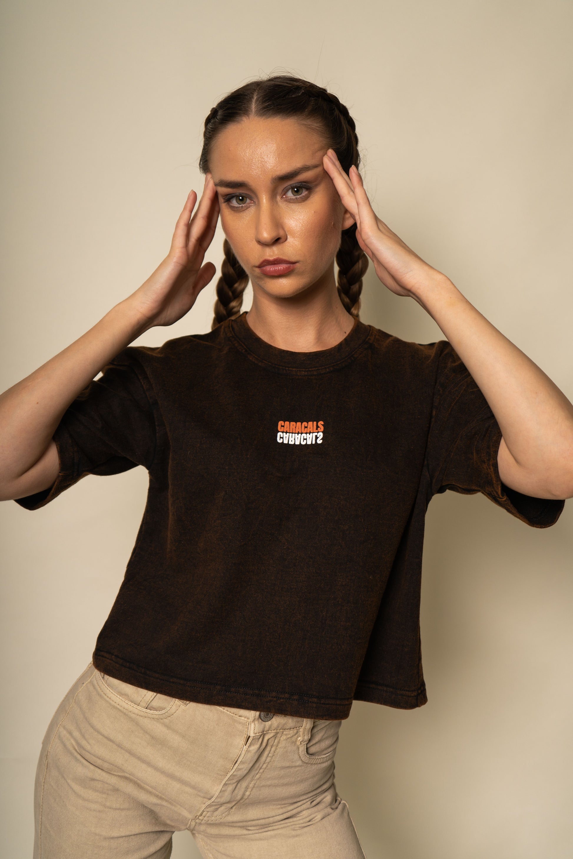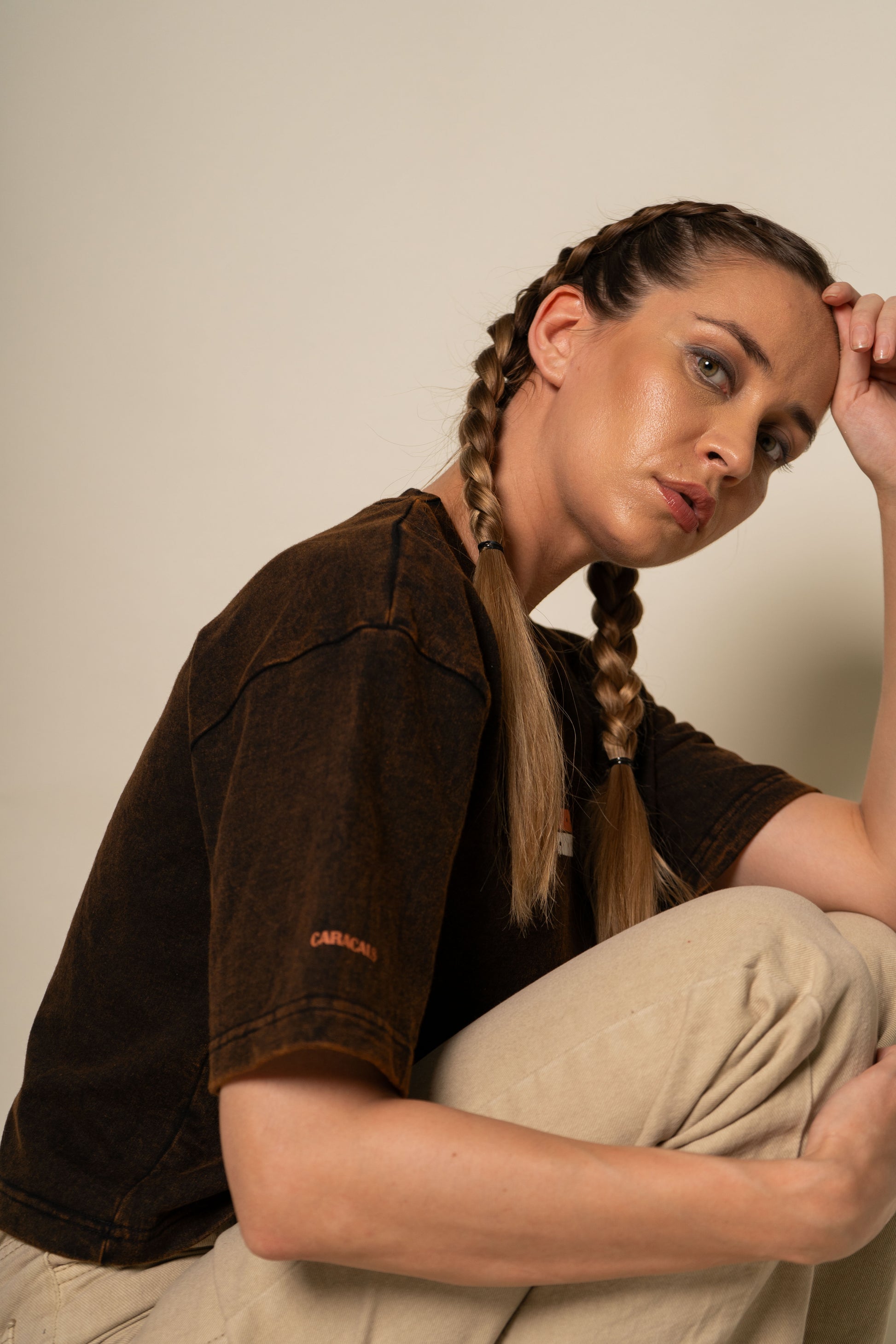 Elevate your wardrobe with our Rust Aura T-Shirt from Caracals! This brown acid wash tee boasts a unique, vintage-inspired vibe and features a striking graphic on the back. It brings an effortless edge to any outfit.Unleash your inner style icon and embrace the laid-back charm of the Rust Aura T-Shirt.