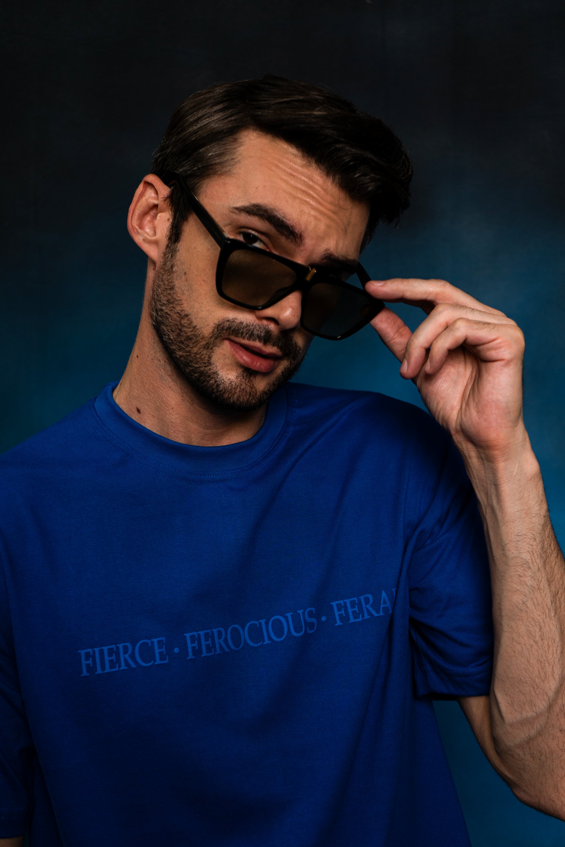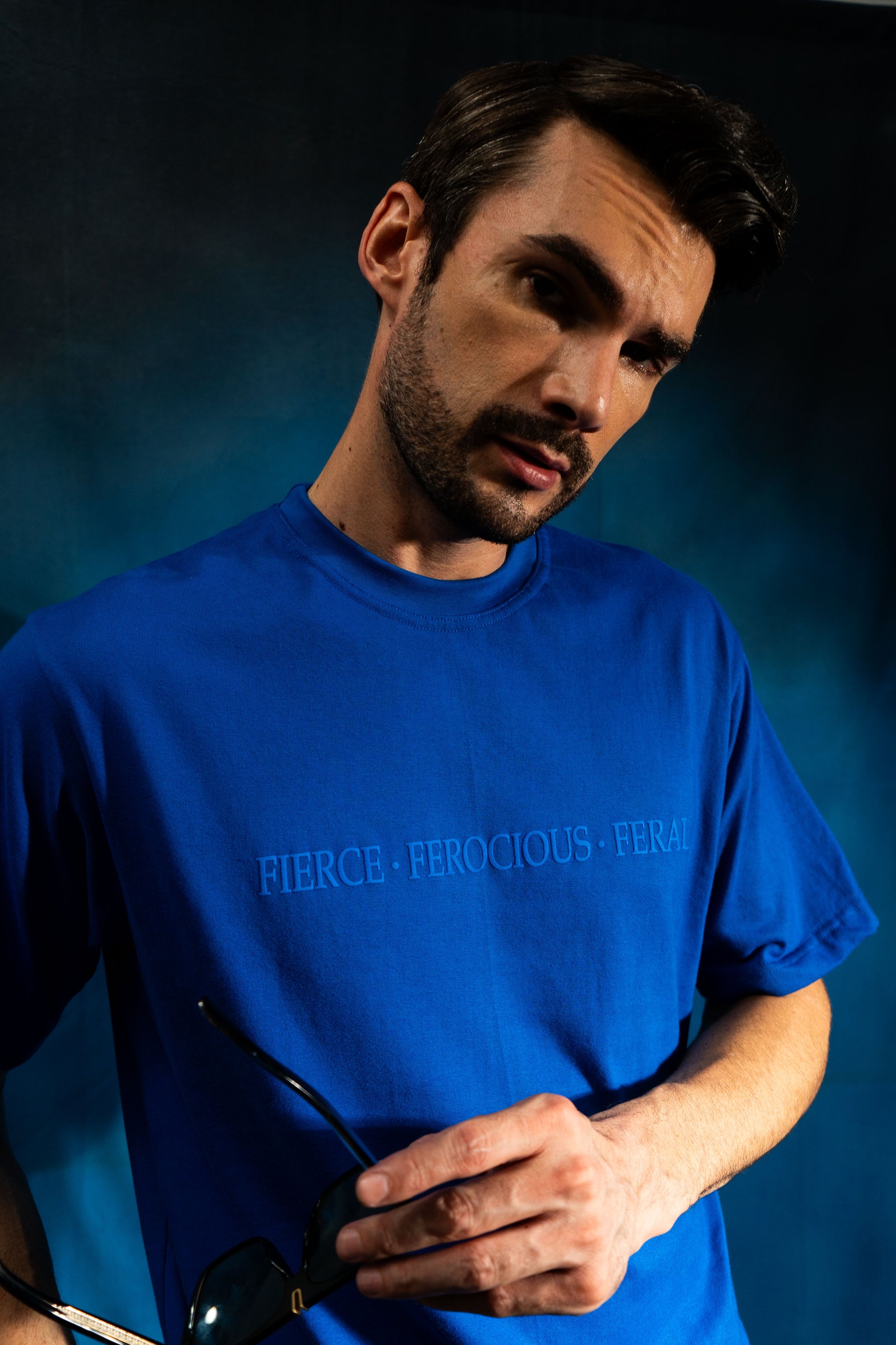 The front features subtle, embossed text in the same blue tone as the shirt, reading "FIERCE FEROCIOUS FERAL," adding a sleek touch to the otherwise simple design.