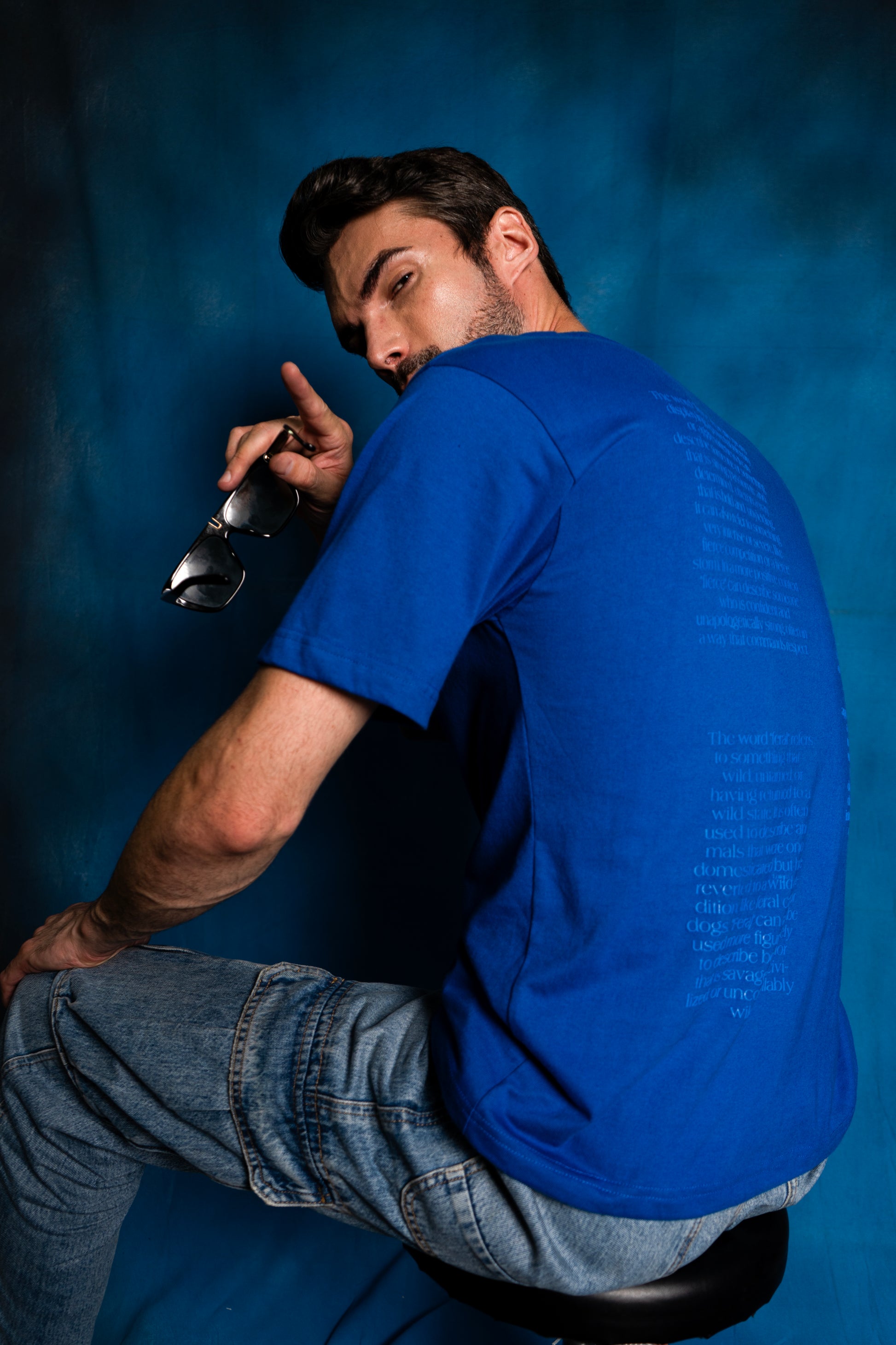 The t-shirt is a bold, solid blue color with a minimalist yet striking design.