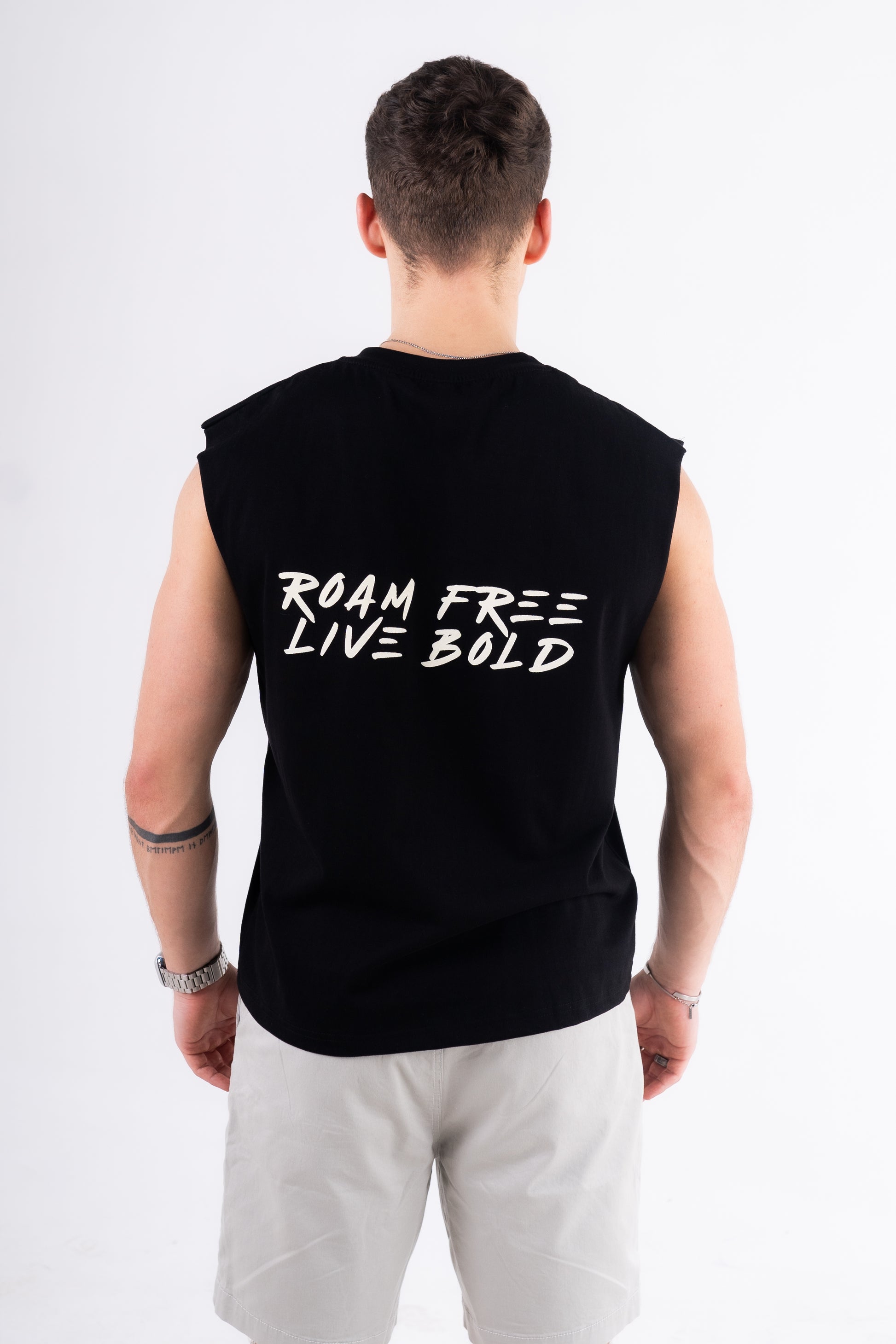 The Sando Half Sleeves in black color feature a bold screen print on both the front and back, offering a striking look with a stylish and comfortable fit.
