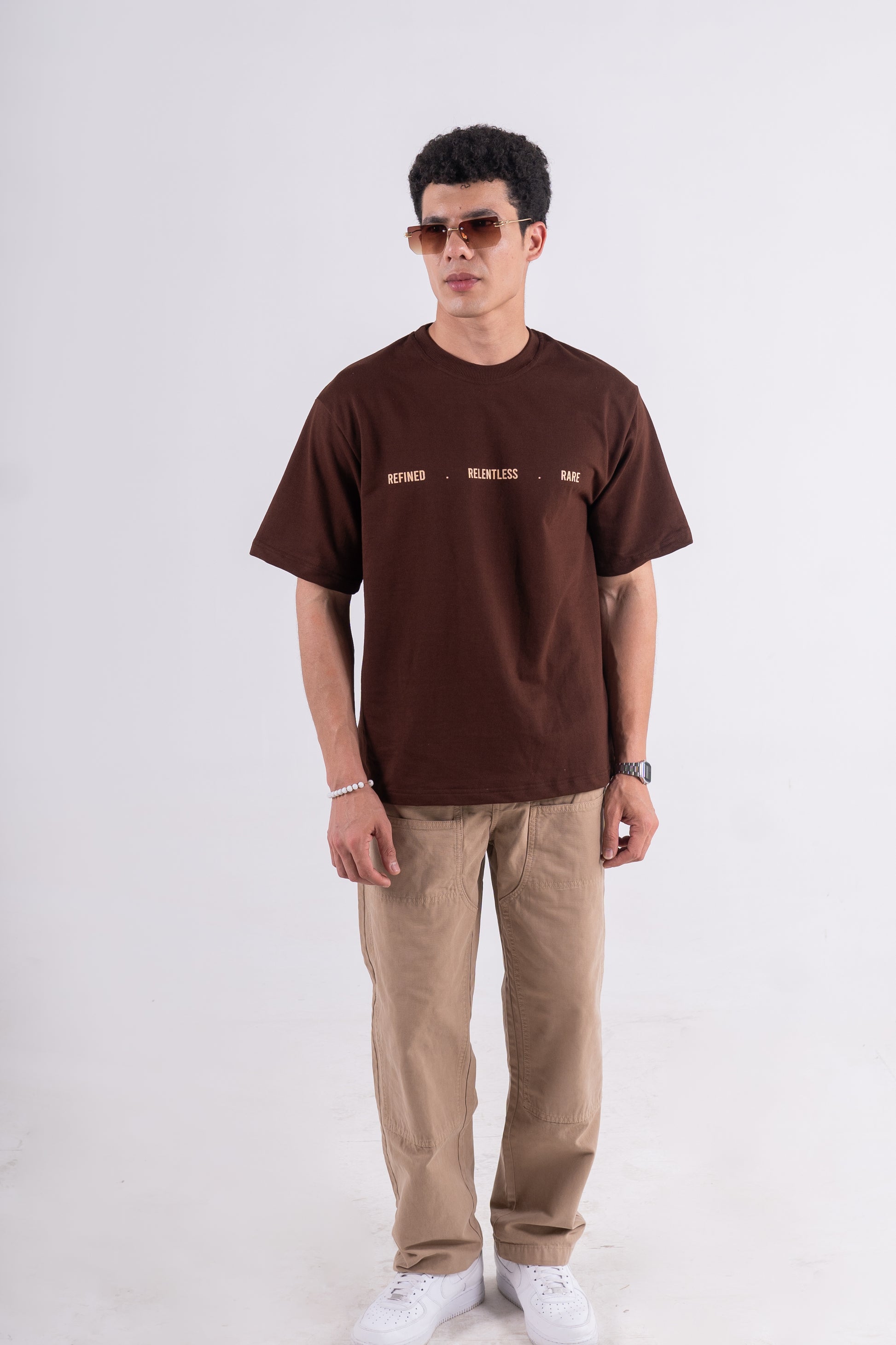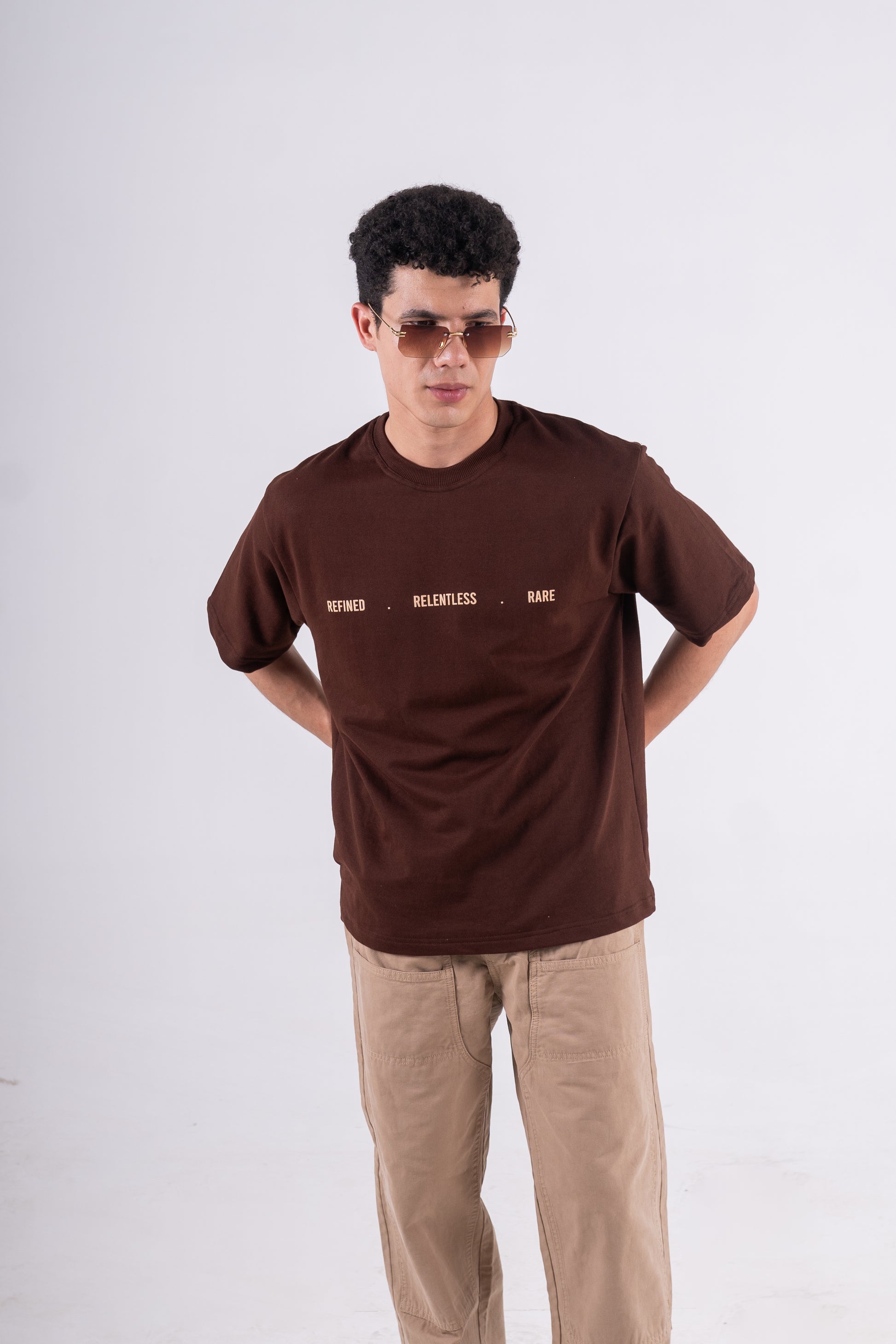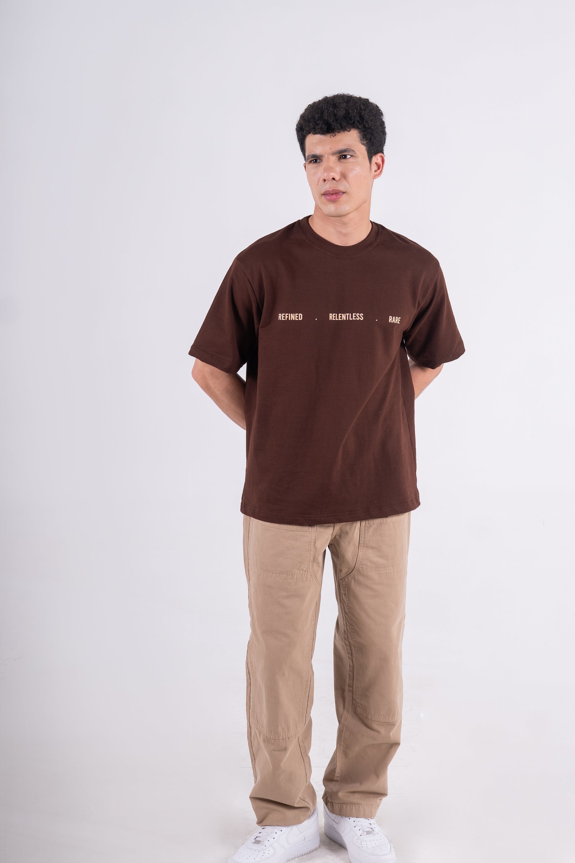 The Caracal Core Values Tee comes in a rich coffee color and is crafted from 100% cotton, offering both comfort and style while showcasing the brand's core values.