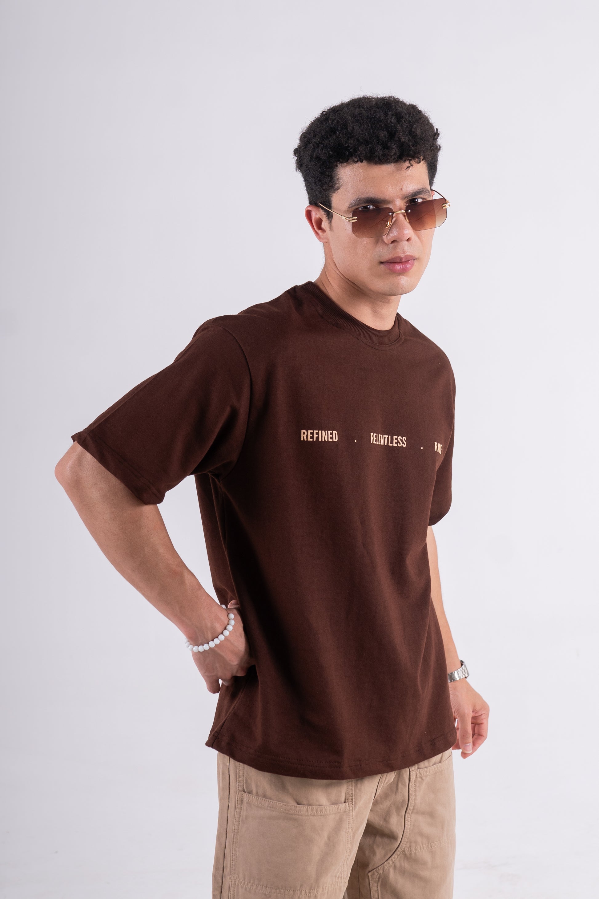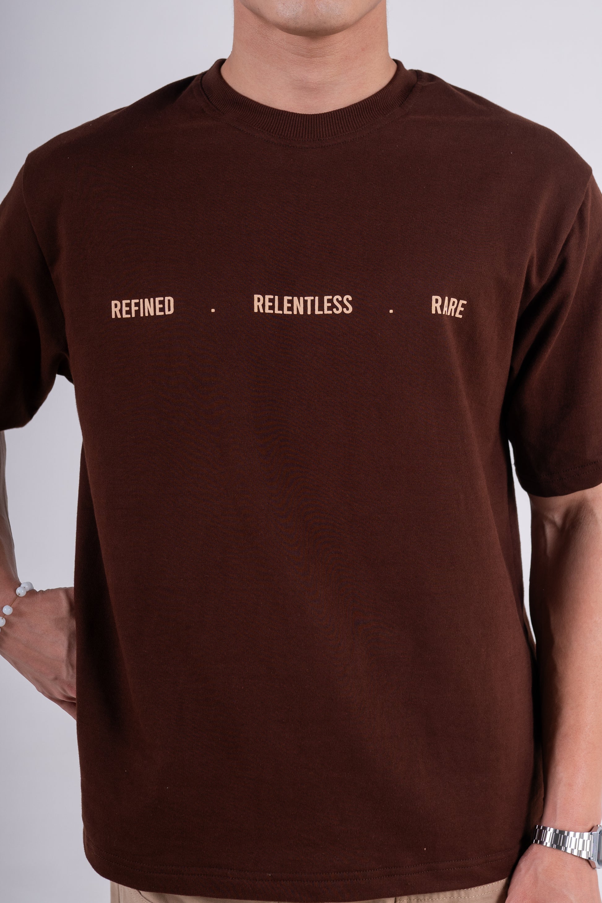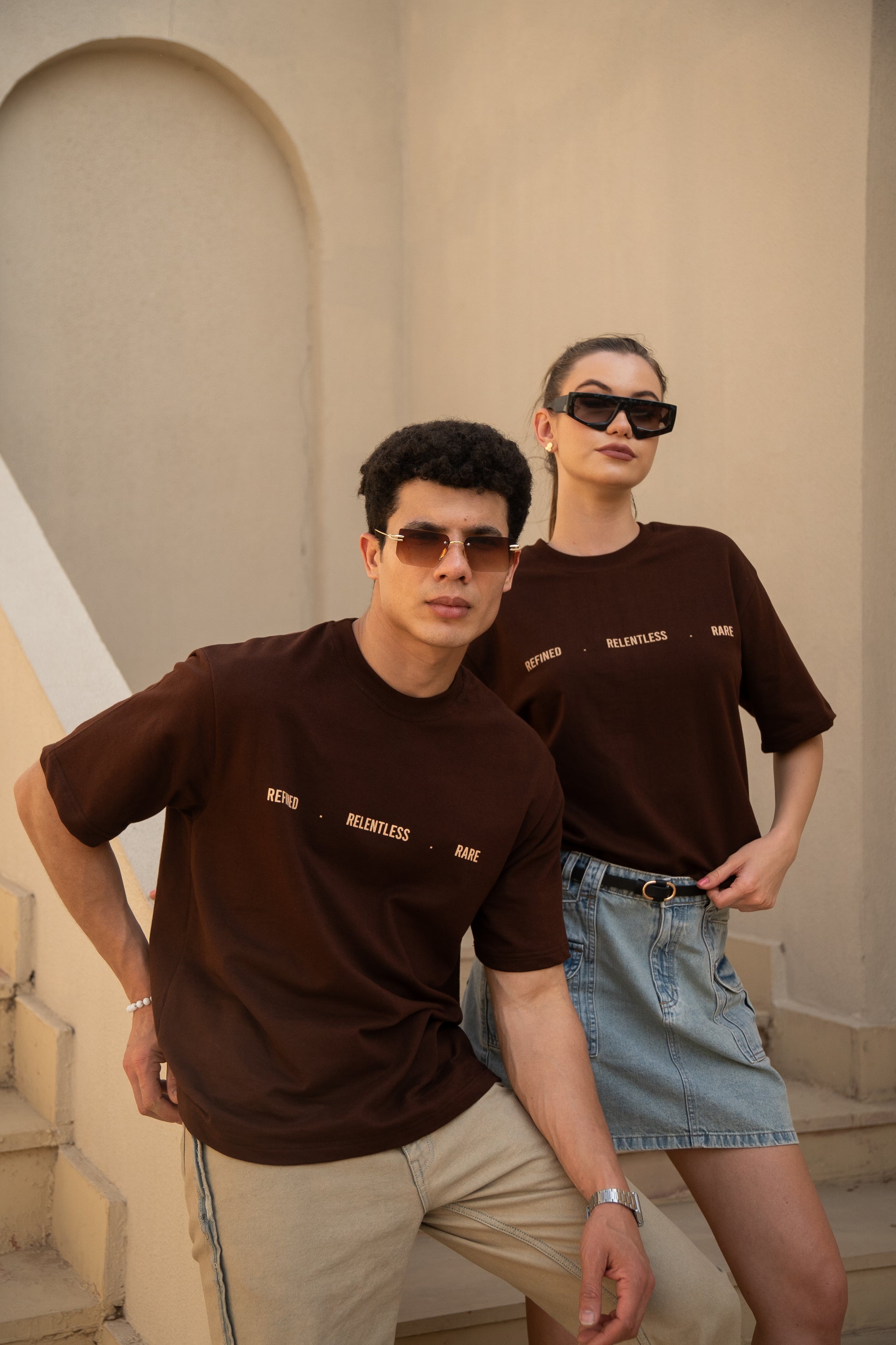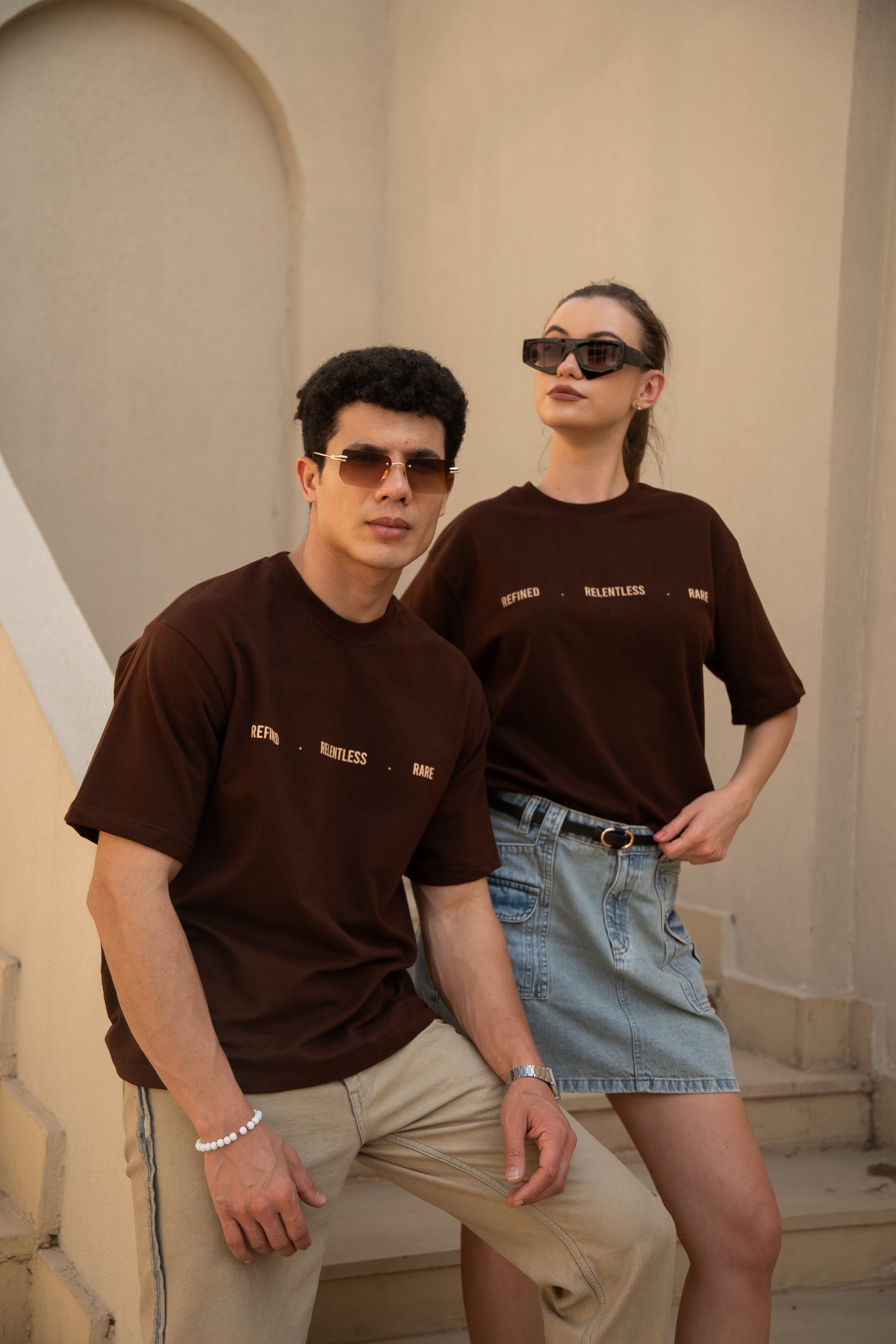 The Caracal Core Values Tee comes in a rich coffee color and is crafted from 100% cotton, offering both comfort and style while showcasing the brand's core values.