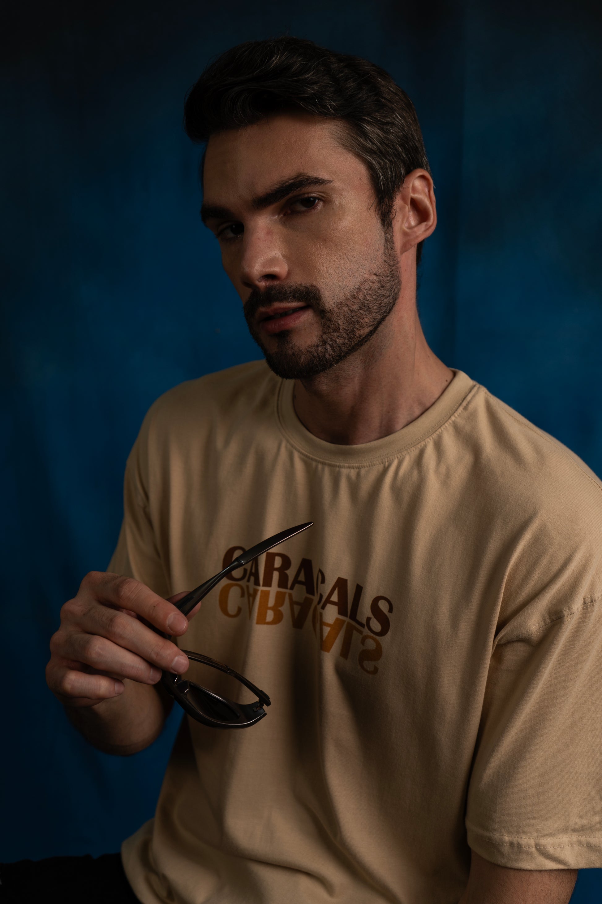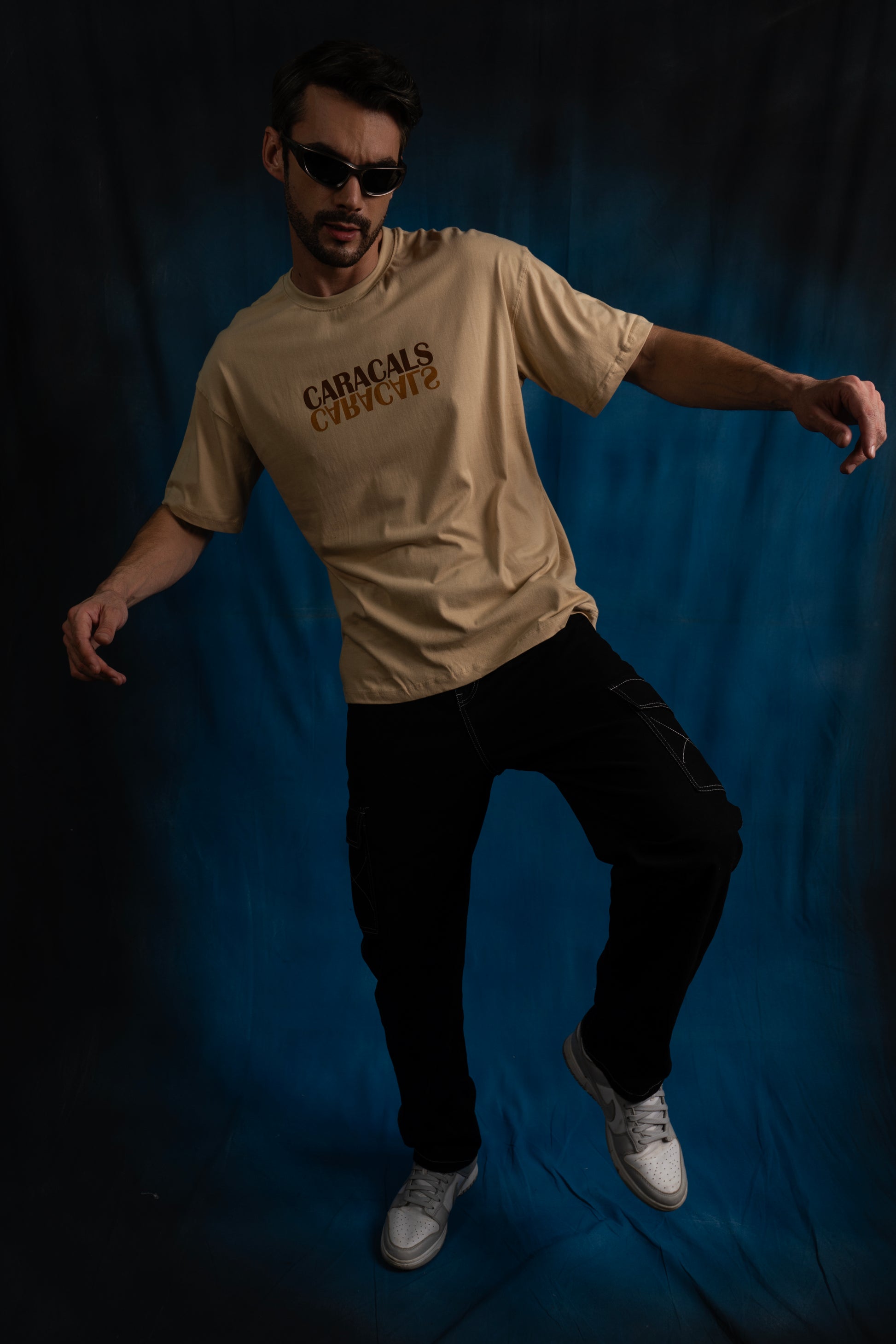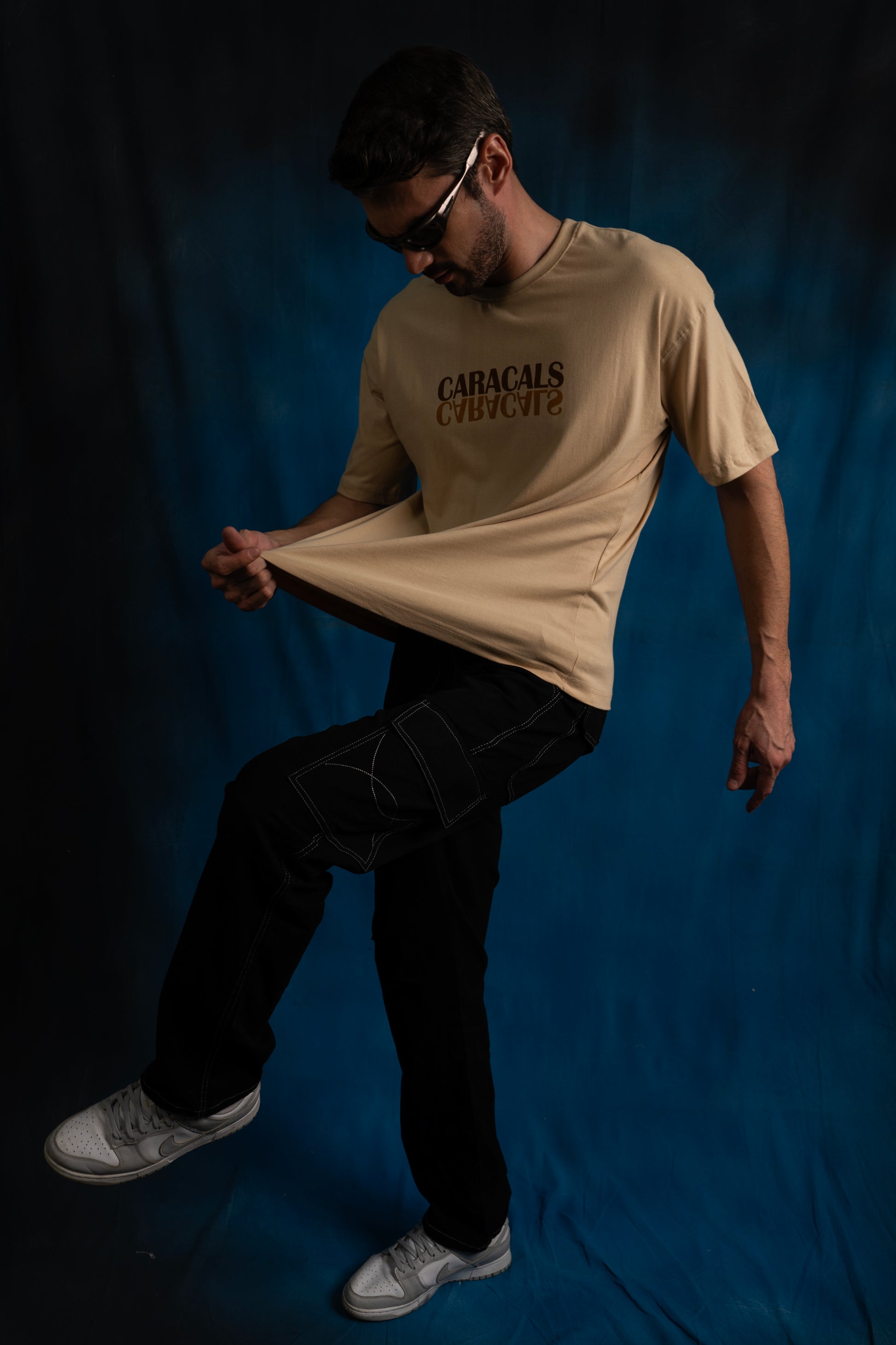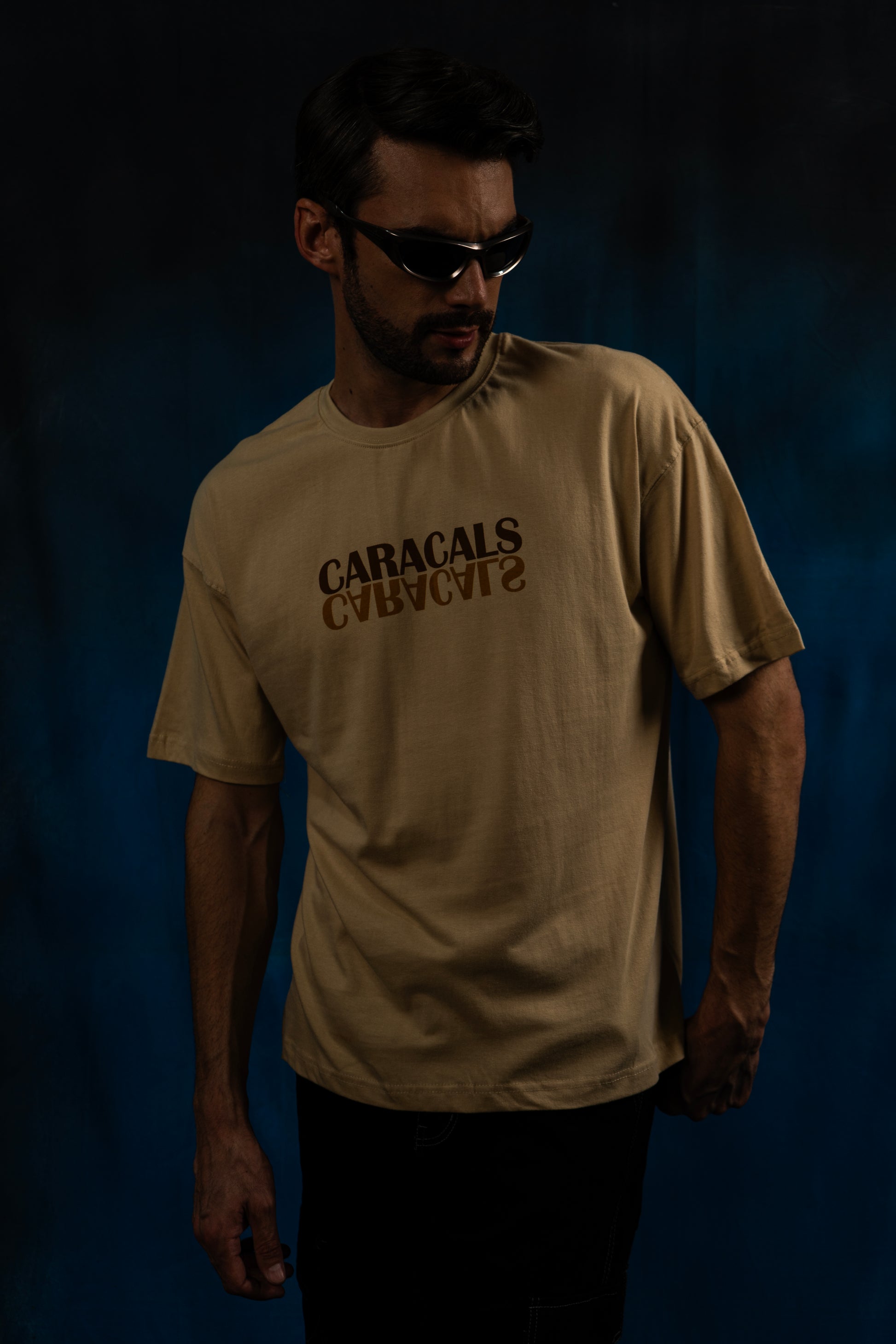 This t-shirt features a minimalist design with a relaxed fit in a beige or sand-like color. The most striking element is the bold "CARACALS" logo across the chest, written in a modern, blocky font. The text is mirrored below the primary logo in a slightly faded effect, adding an edgy visual layer.